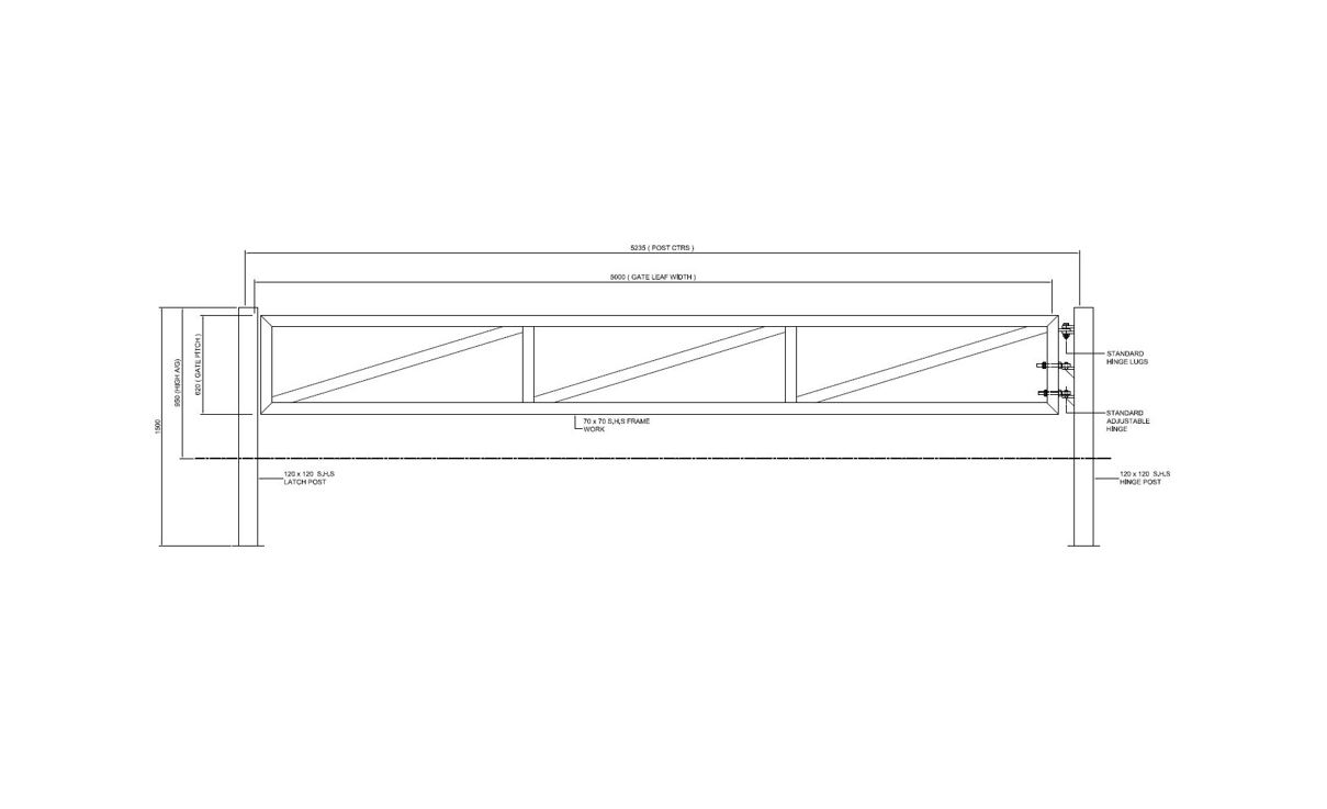 950mm HIGH A/G (620mm PITCH) x WIDTH REQUIRED /CLEAR OPENING REQUIRED x COMPRISING OF 70 x 70 S.H.S FRAMEWORK & 120 x 120 S.H.S POSTS C/W 3No. STANDARD HINGES