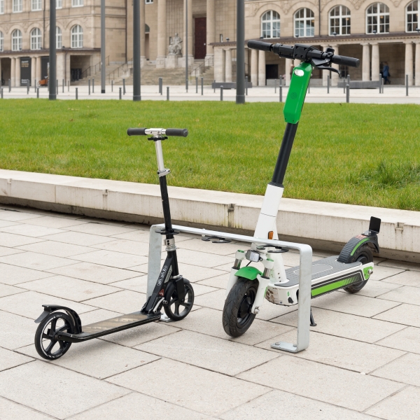 Elegant yet sturdy parking stand for 5 scooters, made from bent flat steel. For parking at both sides Unobtrusive, elegant design. Enhances the streetscape.